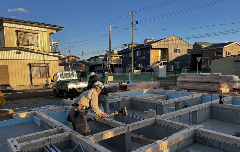 しっかりと基礎天端を確認~修正して土台(檜)敷きの大工さん作業に入ります。