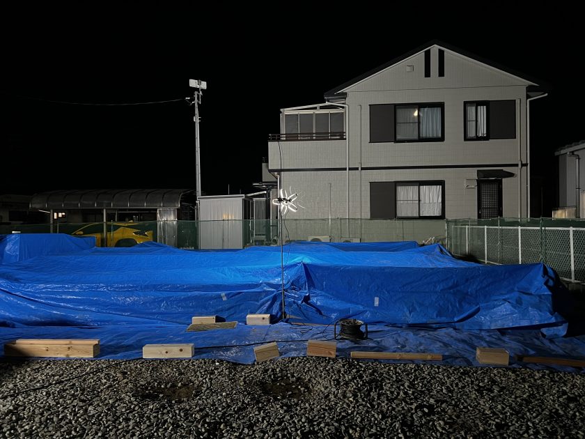 ブルーシートでガッチリと養生。一緒に外部足場の建つ外周部にもブルーシートを敷いて養生も完了です。