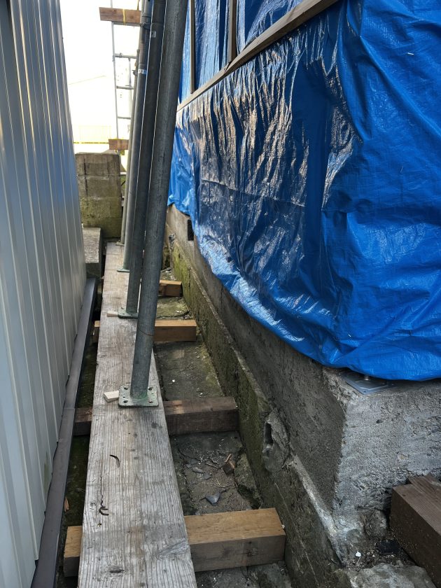 まずは土台の入替作業前に仮筋違いで全体を固めておきながら油圧ジャッキで建物をあげてパイプサポートを使いゆっくりと支えていきます。