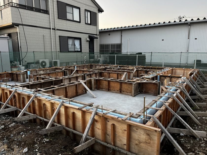 現場では前回のコンクリート打設から養生期間をおいて基礎立上り型枠組み、アンカーボルト・ホールダウンアンカーボルトの設置等の作業が完了しましたので立上りコンクリート打設前・社内検査を行ないました。