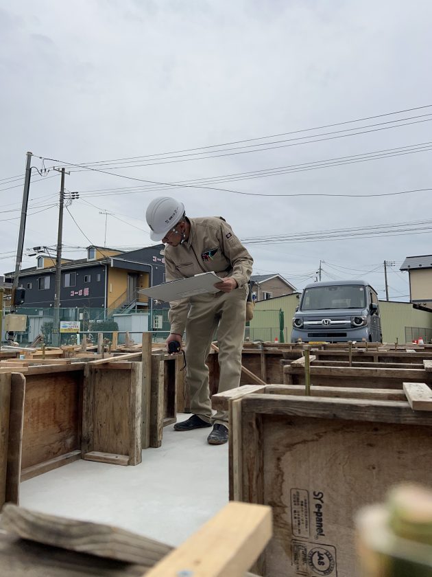 検査では立上り型枠位置、段差止め枠位置、アンカーボルト、ホールダウンアンカーボルト、人通口位置寸法、打ち込み基礎断熱材の有無等が設計図の通り配置されているか図面の寸法を確認しながら墨出し位置、配置を項目順に確認していきます。