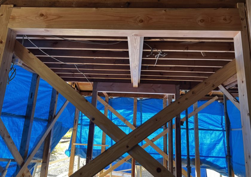 現場では基礎工事、木工事が進み長い年月で傷んだ箇所の補強として構造体を松材梁、桧柱で補強しました。