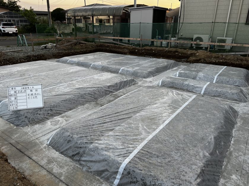 ここから作業手順は会社さんにより様々だとは思いますが弊社では 土に接する部分の基礎最小かぶり厚さ60mm(※鉄筋組立後のかぶり厚さは、最小かぶり厚さ以上とする。) を常に確認するため初めに外周型枠を組み立て少しずつ動きのある基礎鉄筋と型枠との間を計測しながら作業を進めて行きます。