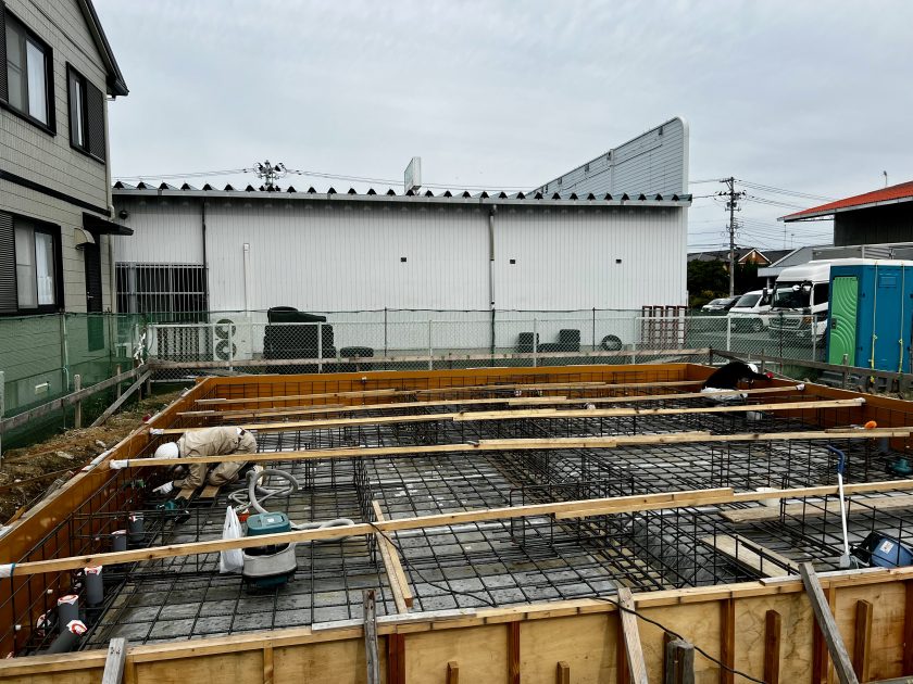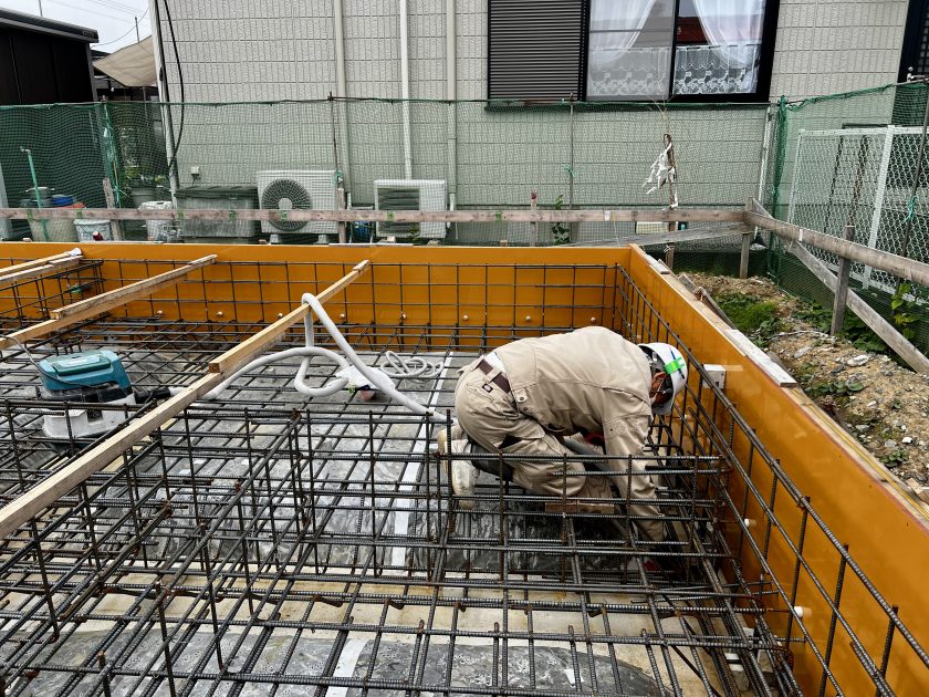基礎配筋完了から社内検査、第三者機関の配筋検査が終わると耐圧板コンクリート打設となりますが再度、打設する範囲を清掃作業。これが必須作業です!