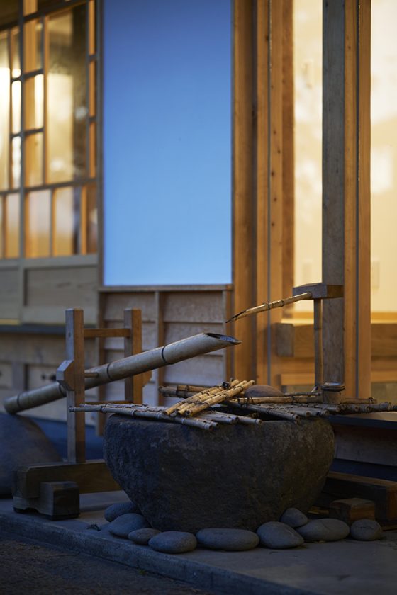 民家再生時に庭先にひっそりと横たわっていた蹲(つくばい)。改築を機につくばいは削り整え、水の出る竹の部分であります筧(かけひ)も新たに創りました。