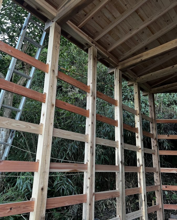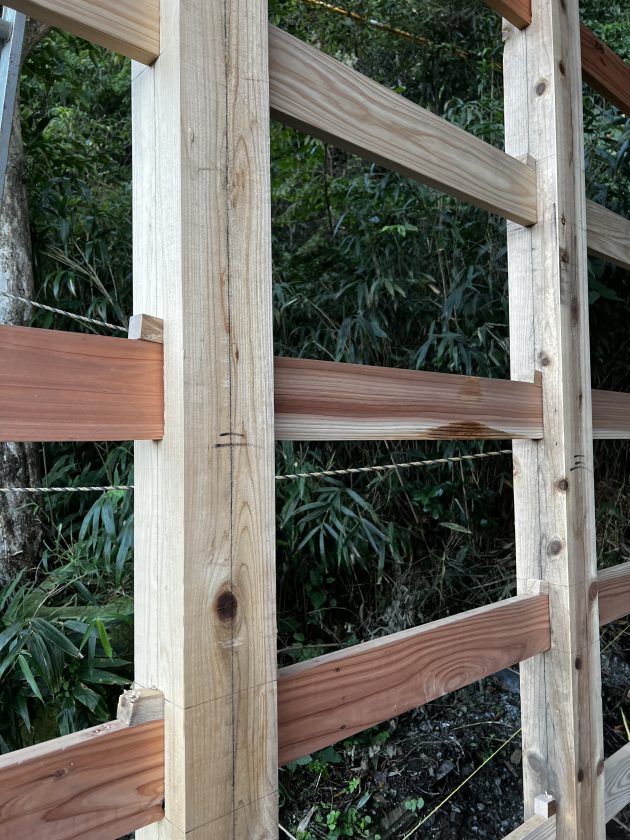 柱に等間隔に30mm幅の穴をあけ貫を通して楔で固定していきます。