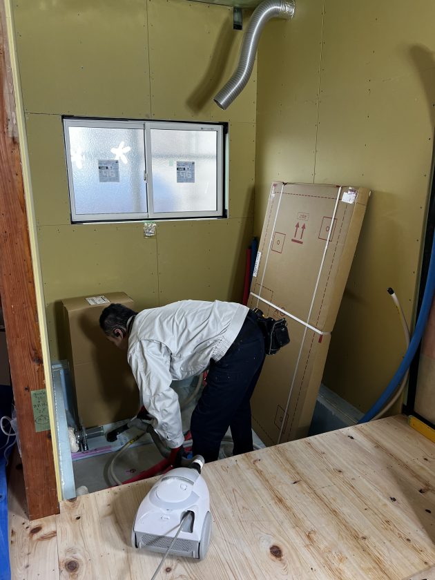 事前に壁・天井の断熱工事、気密工事、外周部の石膏ボード張りを完了してユニットバス屋さんが施工に入ります。