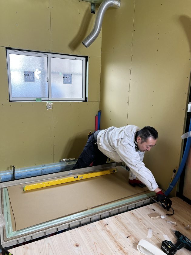次に床パネルの設置。こちらはユニットバス全体の基準、土台となる大切な材料ですので位置を確認しながら設置していきます。